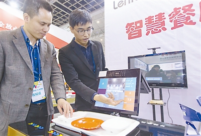 餐饮博览会上,参展商在为观众介绍可人脸识别结算的智慧餐台。